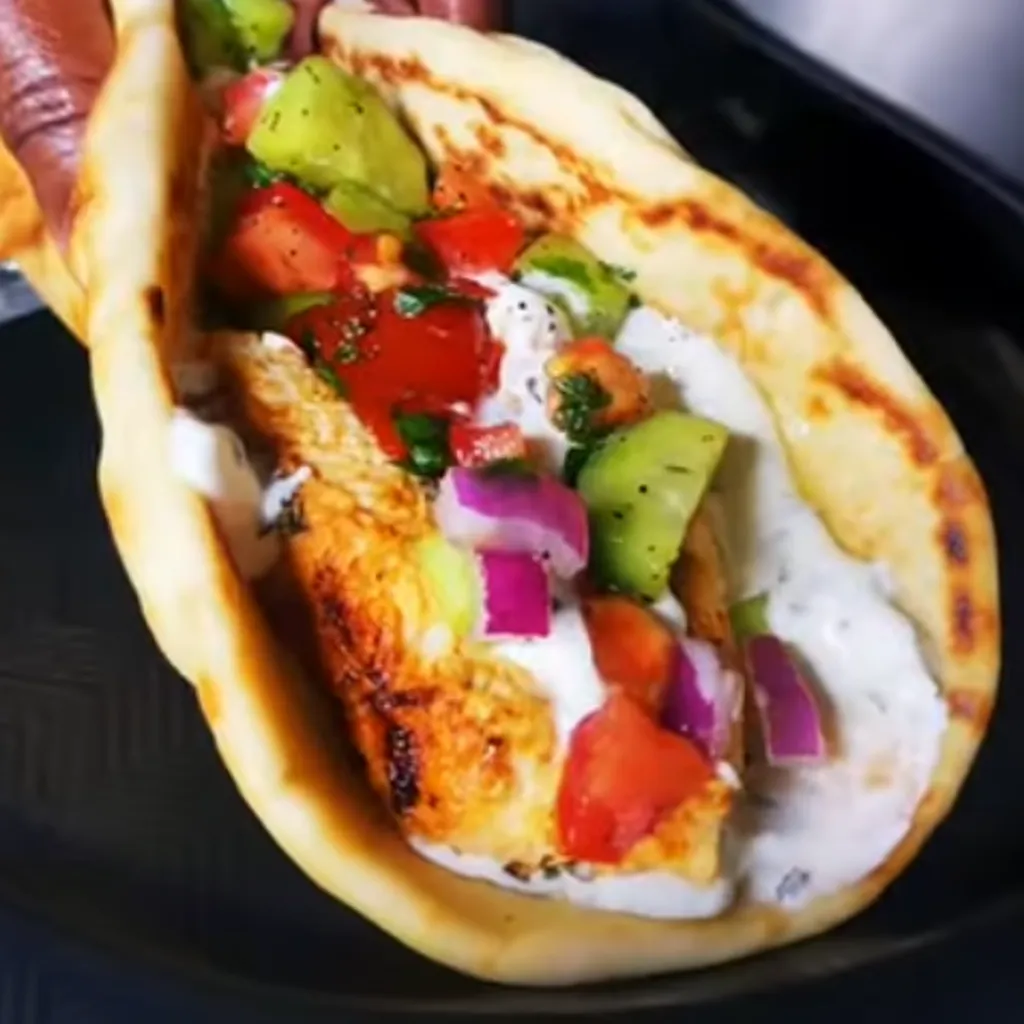 - Warm pita bread in a dry pan or oven. Fill each pita with slices of chicken, and top with salad and tzatziki sauce.
