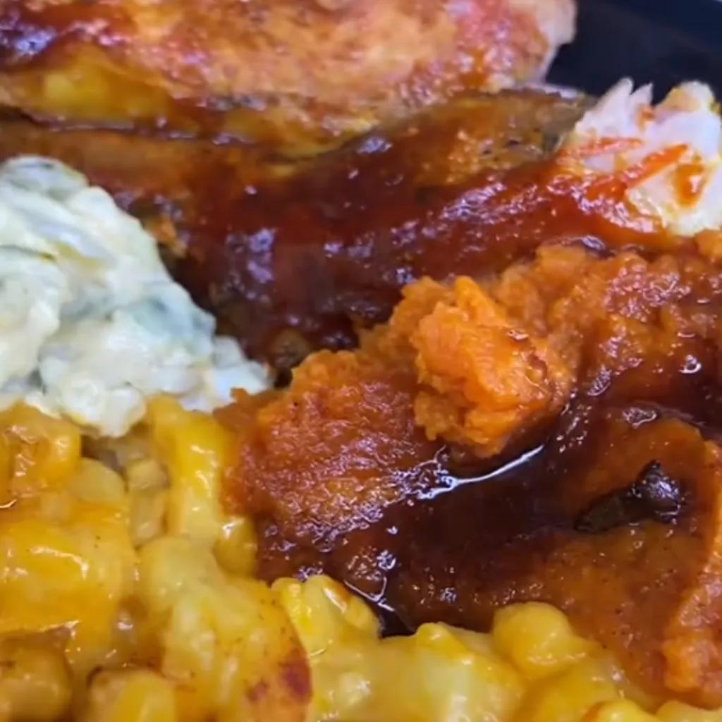 Flavor Explosion Combo: Mac Salad, Stewed Jerk Chicken, and Garlic Spinach