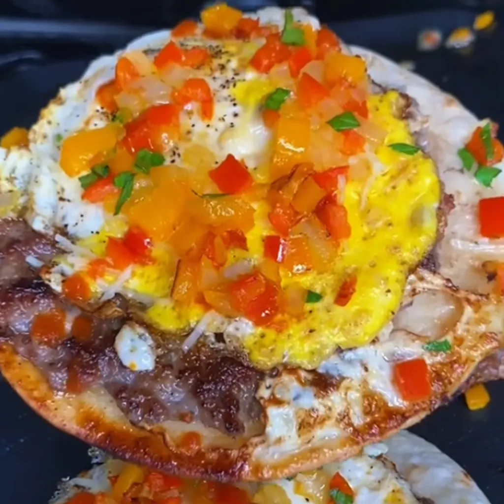 - Place one fried egg on each sausage-topped tortilla.