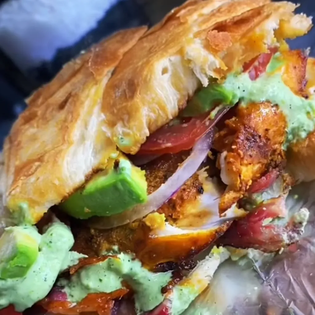 This Avocado Bacon Chicken Croissant is a mouthwatering delight that combines tender, marinated chicken with crispy beef bacon and a zesty cilantro lime sauce. Perfect for lunchtime indulgence or a gourmet snack, this sandwich is packed with bold flavors and satisfying textures.