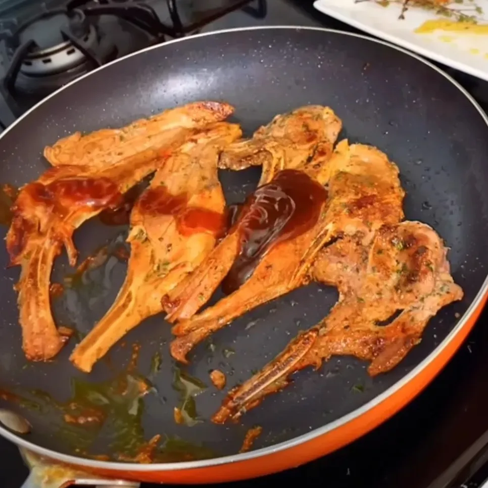 - Drizzle barbecue sauce over the chops and let it caramelize for 1-2 minutes.